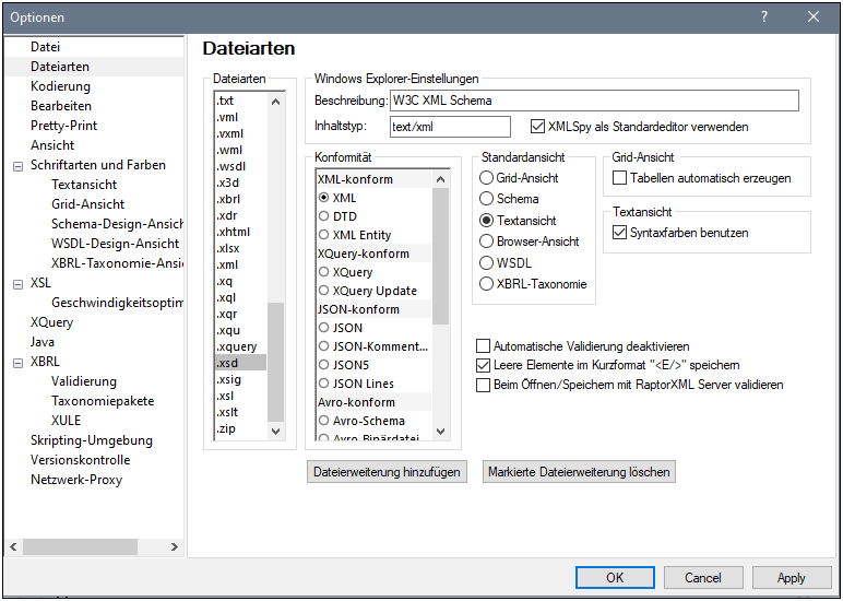 2.Scrollen Sie im Bereich Dateiarten hinunter zum Eintrag .xsd und wählen Sie diesen aus (siehe Abbildung).