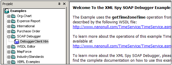Ein Webservice wird normalerweise über eine HTML-Seite aufgerufen. Ein Beispiel dafür ist DebuggerClient.htm, welches Sie im Ordner Examples sowie im XMLSpy-Projekt unter Examples/SoapDebugger (Öffnen Sie Examples.spp, um mit dem Projekt zu arbeiten) finden. Um den auf dieser Seiten angezeigten Webservice aufzurufen, gehen Sie folgendermaßen vor: