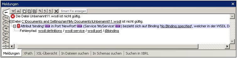 Nach Fertigstellung des WSDL-Dokuments können Sie es durch Auswahl des Befehls XML | XML validieren (F8) validieren. Die Ergebnisse der Validierung werden unterhalb des Hauptfensters im Fenster "Meldungen" angezeigt (Abbildung unten).