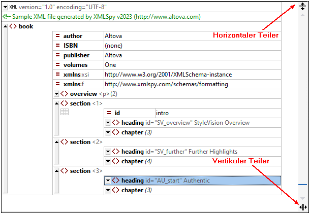 In der geteilten Ansicht wird das Hauptfenster der Grid-Ansicht vertikal oder horizontal in zwei Bereiche geteilt und das aktive Dokument wird in beiden Ansichten angezeigt. Sie können in jeder Ansicht separat navigieren, wodurch Sie verschiedene Teile des Dokuments Seite an Seite nebeneinander sehen können. Die Änderungen, die Sie in jeder der beiden Ansichten vornehmen, werden am zugrunde liegenden Dokument gemacht und sofort in der anderen Ansicht angezeigt.