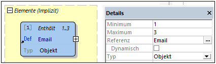 Die Angaben 3 <= Elemente <= 3 und Elemente: 3..3 (siehe Abbildung oben) geben die Mindest- und Maximalanzahl der zulässigen Elemente an. In diesem Fall müssen genau drei Elemente vorhanden sein.