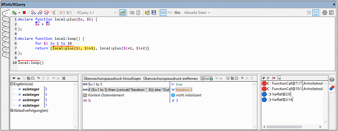 Variablen, die im Ausdruck deklariert wurden und sich im aktuellen Auswertungsschritt im Geltungsbereich befinden, werden zusammen mit den jeweiligen aktuellen Werten angezeigt. So wurde z.B. in der Abbildung oben der Aufruf der Funktion local:plus erreicht. Die Variable $i befindet sich in der Funktion local:loop im Geltungsbereich und wurde soeben auf 2 inkrementiert, daher wird $i mit ihrem aktuellen Wert angezeigt. Sie können lokale und globale Variablen durch Klick auf die entsprechende Symbolleisten-Schaltfläche ein- und ausblenden.