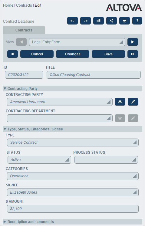 The Record Page (screenshot below) displays the data of a single record of a data table. You can select different data entry forms to view and edit the record's data in different layouts. Note that different data entry forms not only have different layouts, but could also show or hide different fields.