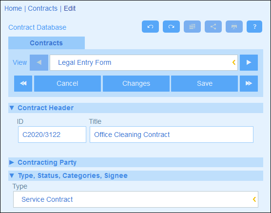 The screenshot below shows the first three sections of a data-entry form, where all sections are on the same page. The first three section names are: (i) Contract Header, (ii) Contracting Party, (iii) Type, Status, Categories, Signee. When the form is initially displayed, the first and third sections are open, while the second is closed. To open/close a section, click the arrow to the left of its name.