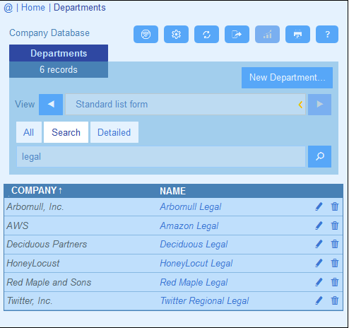 1.In the View combo box of a data table, choose a record listing form for displaying the records of the data table. For example, the screenshot below shows the records of a Departments data table, with the records being listed in a listing form named Standard list form.