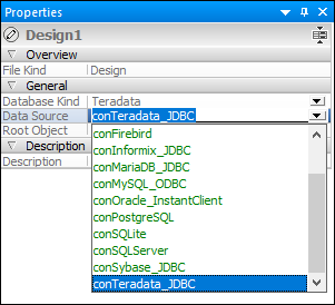 Alternatively, if the Execution Target Bar is visible in the Design Editor, click the data source or root object in the Execution Target Bar to jump directly to the corresponding field in the Properties window. Note that only connected data sources are available in the drop-down list.