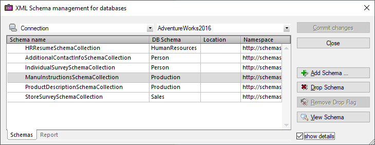 You can now add schemas, drop schemas, or view a schema in XMLSpy by clicking the corresponding buttons. You can also edit a schema's description (and "Decomposition" property if applicable) directly from the grid.