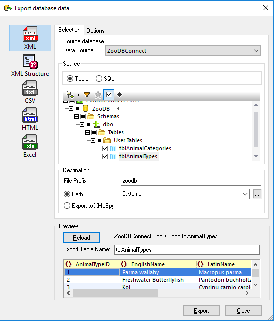 With DatabaseSpy, you can export database data to XML, CSV, HTML, and Excel formats. You can export either selected tables or the result of custom SELECT statements. The instructions below show you how to export data from selected database tables, as XML.