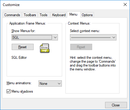 The Default Menu bar is the menu bar that is displayed when no document is open in the main window. The SQL menu bar is the menu bar that is displayed when a file is open in SQL Editor. The Design menu bar is the menu bar that is displayed when a file is open in Design Editor. Each menu bar can be customized separately, and customization changes made to one do not affect the other.