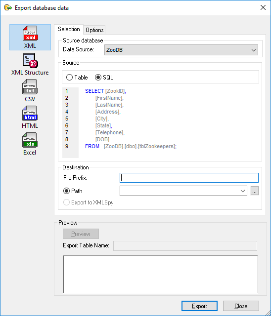 5.Optionally, click the Options tab to change the options for XML, XML Structure, CSV, HTML, or Excel.