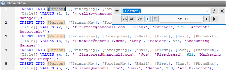 You can search for a term in the entire document or within a text selection. To start a search in SQL Editor, press Ctrl+F or select the menu command Edit | Find. You can enter a string or use the combo box to select a string from one of the last 10 strings. When you enter or select a string, all matches are highlighted, and the positions of the matches are indicated by orange markers in the scroll bar (see screenshot below). The position of the currently selected match (highlighted in gray) depends on where the cursor was last located.