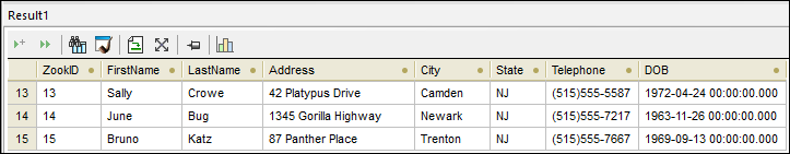 INSERT INTO [ZooDB].[dbo].[tblZookeepers] ([FirstName],  [LastName], [Address], [City], [State], [Telephone], [DOB])