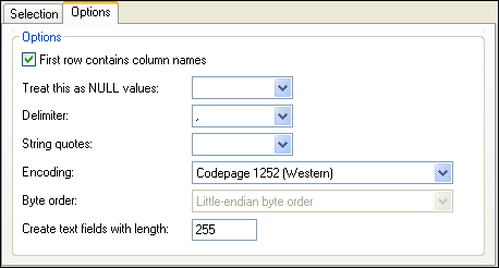 If the files you are importing contain column names, select the First row contains column names check box to exclude them from the import. In the Treat this as NULL values drop-down list, you can choose the character that should be recognized as a NULL value in the file being imported. The delimiter character and the quotes to be used to identify strings can also be selected from the respective drop-down lists. In the Encoding drop-down list, select the encoding of the files you are importing from the drop-down list. If a two- or four-byte encoding is selected as the default encoding (i.e., UTF-16, UCS-2, or UCS-4), you can choose between little-endian and big-endian byte ordering. A fixed length of the text fields being imported can be defined in the Create text fields with length field.