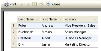 The example above shows the result of a retrieval of an employees table. You can select particular names in this result (e.g., all the managers) and print only their names and positions (see screenshot below). Only selected rows and columns will be printed.