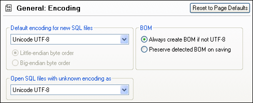 Define the default encoding for new files so that each new document includes the encoding-specification that you specify here. If a two- or four-byte encoding is selected as the default encoding (i.e., UTF-16, UCS-2, or UCS-4), you can also choose between little-endian and big-endian byte ordering for the SQL files. The encoding for existing files will, of course, always be retained.