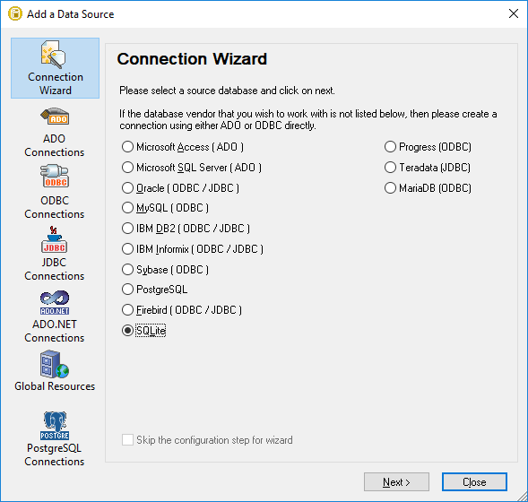 1.Run DatabaseSpy. The Add a Data Source dialog box opens. (You can open this dialog box at any time using the menu command File | Create a Database Connection.)