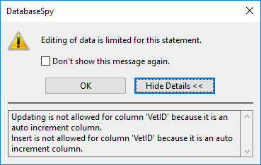 2.In the Online Browser, right-click the tblVeterinarians table and select Edit Data from the context menu. Alternatively, select the table and press Ctrl+Alt+E. A dialog box appears, informing you that editing of data is limited for this table. This warning merely indicates that the table is designed with automatically incremented columns. Such columns are automatically updated by the database upon inserting the record, so you cannot type data into such columns manually. All other columns can still be updated manually.