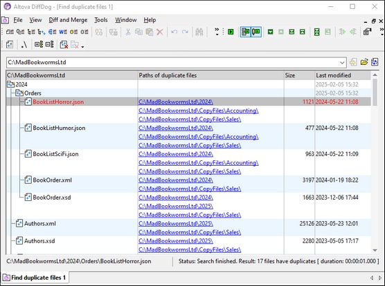 The screenshot below illustrates the Find Duplicate Files window. DiffDog has scanned the C:\MadBookwormsLtd directory and found that 17 files have duplicates. The status and the number of files with duplicates are displayed at the bottom of the Find Duplicate Files window.