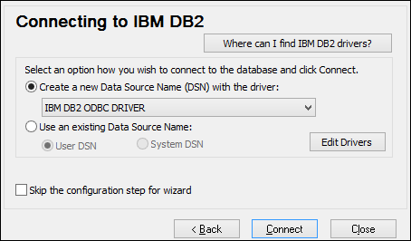 4.Select the IBM DB2 driver you want from the list, and then click Connect. (To edit the list of available drivers, click Edit Drivers, and then check or uncheck the IBM DB2 drivers you wish to add or remove, respectively.)