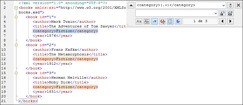 3.In the Find field, enter the following text: <category>(.+)</category> . This regular expression matches all category elements, and they become highlighted.