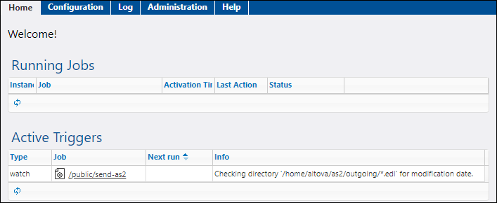On Hermes machine, copy an .edi file to the directory configured previously, /home/altova/as2/outgoing. When the directory polling interval elapses (60 seconds, by default), the trigger is executed, and the job sends the file to the AS2 service on Apollo machine.