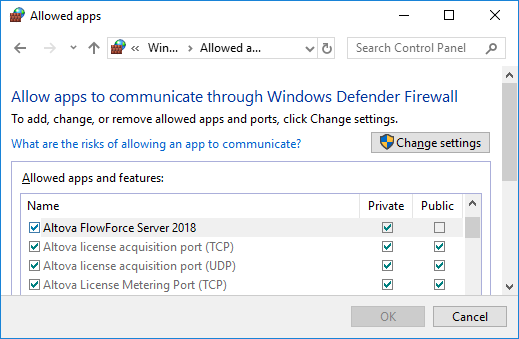 2.Make sure that FlowForce Server is allowed to communicate through the operating system's firewall. In this example, since the "Apollo" FlowForce Server runs on Windows, it must be allowed to communicate through Windows Defender Firewall.