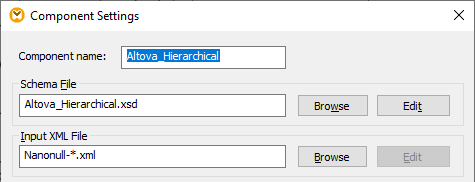 The mapping takes as input any XML file that begins with "Nanonull-", from the directory <Documents>\Altova\MapForce2024\MapForceExamples . This is defined in the source MapForce component settings (in MapForce, right-click the header of the Altova_Hierarchical component illustrated below, and select Properties from the context menu). Notice that "Input File" is set to Nanonull-*.xml, where the asterisk is a wildcard. Literally, the input is any file which begins with "Nanonull-" and has the .xml extension.