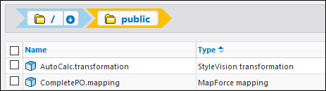 2.In FlowForce Server, navigate to the FlowForce container where you deployed the mapping or transformation (for example, the container "/public"). Deployed mappings have a .mapping extension, while deployed transformations have a .transformation extension (screenshot below).