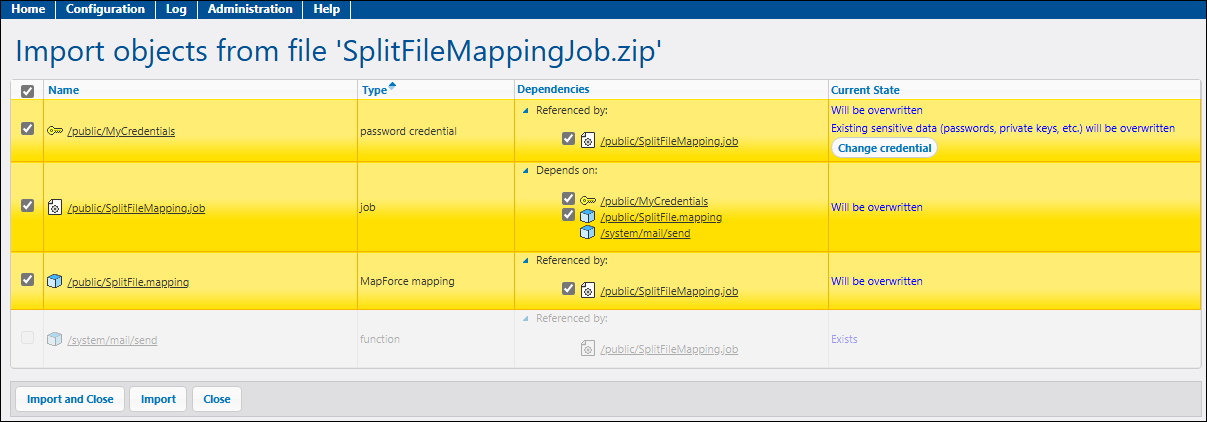 3.Click Import. FlowForce Server displays the records that are about to be imported, along with their dependencies (screenshot below). The Current State column informs you about what will happen to each record after you click the Import and Close or Import button.