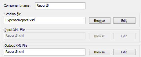 Finally, the third component is configured to produce an output file called ReportC.xml. The Input XML File field is irrelevant here, because this is a target component.