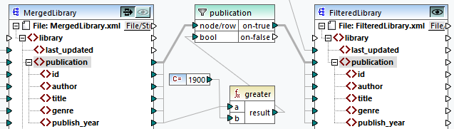 After the publication function has been deleted, the copy-all connection has been created directly between the publication node in MergedLibrary and the publication node in FilteredLibrary (see screenshot below).