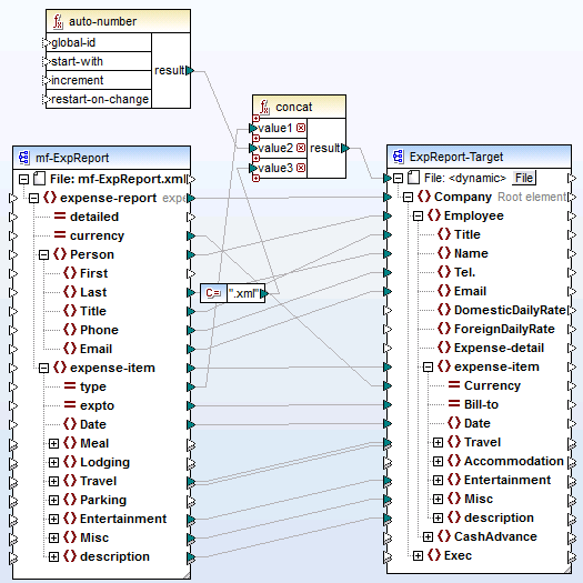 This example shows you how to generate dynamically multiple XML files from a single source XML file. The accompanying mapping for this example is available at the following path: <Documents>\Altova\MapForce2024\MapForceExamples\Tutorial\Tut-ExpReport-dyn.mfd.