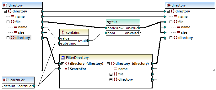 This topic explains how to search for data in a source XML file with the help of a recursive UDF. To test the recursive UDF, you will need the following mapping: MapForceExamples\RecursiveDirectoryFilter.mfd. In the mapping below, the FilterDirectory UDF receives data from the source file Directory.xml and the simple input component SearchFor that supplies the .xml extension. After the data has been processed by the UDF, it is mapped to the target file.