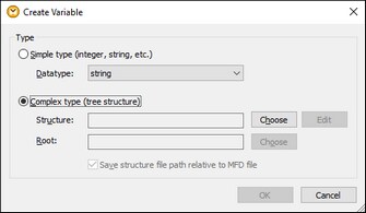 3.Click Choose to select the source which should provide the structure of the variable. The structures illustrated in the screenshot below only apply to MapForce Enterprise Edition. See the list of structures relevant to other MapForce editions in the previous topic.