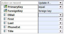![]() "Department" table ![]() "Person" table | •Updates Department records where PrimaryKey in the source XML corresponds to the PrimaryKey in the database table. •Does not update existing Department records which do not have a counterpart in the input XML file (no such key exists in the source). •Deletes all Person records linked to a Department which has a corresponding PrimaryKey in the source XML. The reason is that the Delete data in child tables option is enabled for the parent Department table. •Person records linked to a department that did not meet the Update if... condition remain in the database. •No records in the Person table are updated. |
