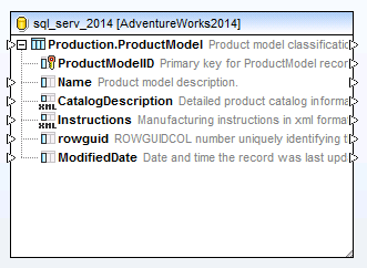 This topic illustrates how to assign a schema to a field that is natively defined as XML type in the database. The instructions below use SQL Server 2014 and the AdventureWorks 2014 database. The latter can be downloaded from the AdventureWorks samples page on GitHub (https://github.com/Microsoft/sql-server-samples/releases/tag/adventureworks). Note that mapping of data to or from XML fields works in the same way with other database types that support XML fields.