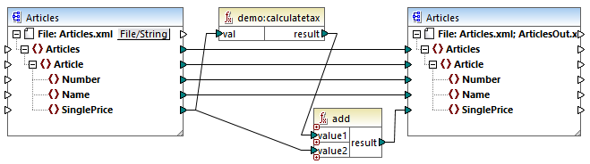 •The MapForce built-in add function adds the tax amount to the original SinglePrice amount and returns the final amount.