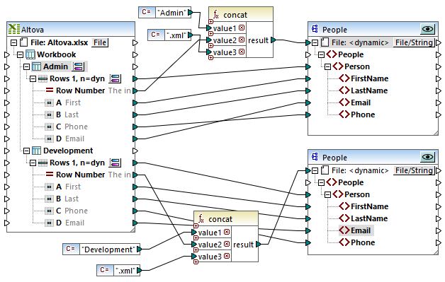 The mapping illustrated above converts data from both Excel worksheets to XML files. A separate XML file must be generated for each person record from each row in each source worksheet. The file name must identify the department name and have a numeric ID. For example, the file Admin1.xml will store the details of the first person (row) in the "Admin" worksheet, and so on. This mapping goal was accomplished as follows: