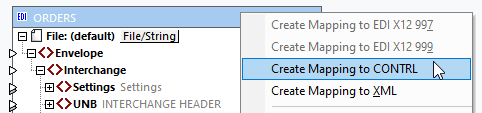 2.Right-click the title bar of the EDI component and select Create Mapping to CONTRL (screenshot below). This creates a CONTRL component with default connections to the source EDIFACT component. Adjust connections, if necessary.