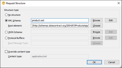 Tip: If you have a sample XML or JSON request file but do not have a schema file, you can use Altova XMLSpy to generate the schema file. If necessary, XMLSpy can also convert your instance file from XML to JSON, or vice versa.