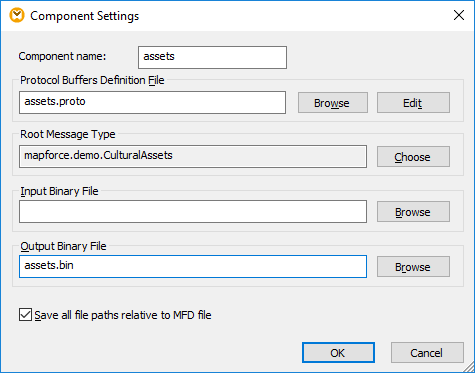 1.On the Insert menu, click Protocol Buffers File, and browse for the following file: <Documents>\Altova\MapForce2025\MapForceExamples\Tutorial\assets.proto.