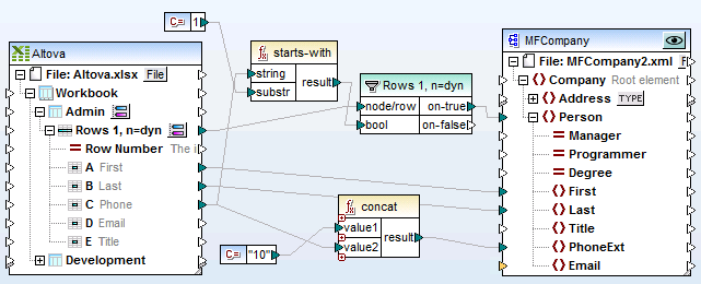•The concat filter adds the prefix "10" to each of the telephone extensions and writes it to the PhoneExt item.