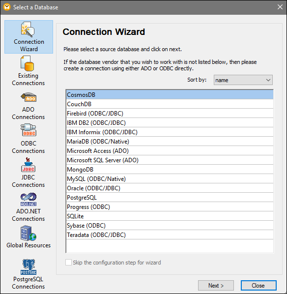 In the Connection Wizard pane (see screenshot below) databases can be sorted alphabetically by the name of the database type or by recent usage. Select the option you want in the Sort By combo box. After you have selected the database type to which you want to connect, click Next.