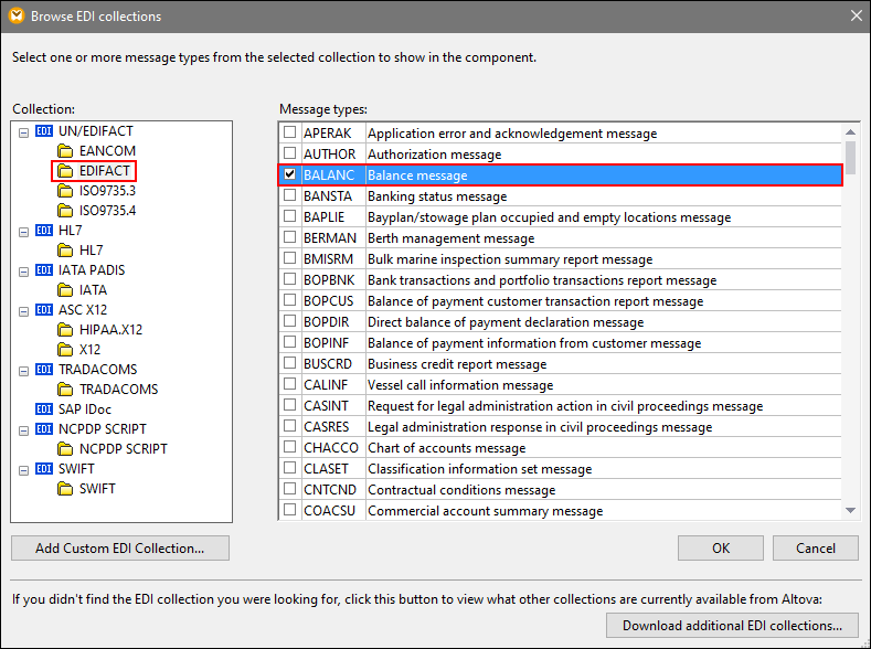 2.Select the relevant EDI collection in the Browse EDI Collections dialog box (see below). In our example, we have selected the EDIFACT collection. If the EDI collection you are looking for is not on the list of collections, click Download additional EDI collections, which will redirect you to the Altova website. If you have created a custom EDI collection, and it is not yet in the list of available collections, you can browse for it using the Add Custom EDI Collection button.