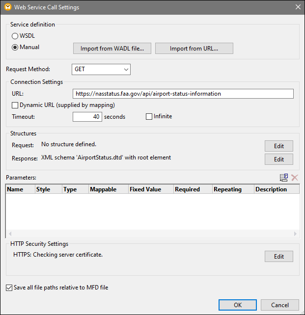 This example shows you how to call a generic HTTP Web service from MapForce. The description of the Web service called in this example can be found at https://app.swaggerhub.com/apis/FAA/ASWS/1.1.0. This Web service returns information about airport statuses (e.g., airport closures, delays, etc.) in different US airports. The example is accompanied by a mapping design that is available at the following path: MapForceExamples\AirportStatus.mfd.