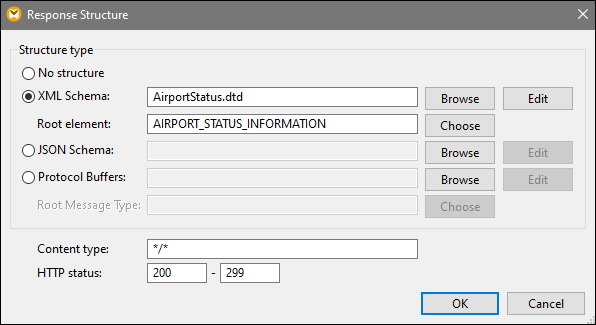 5.In the Structures section of the Web Service Call Settings dialog, click the Edit button next to the Response field. This opens the Response Structure dialog (see below), in which you need to supply the schema of the Web service response. The schema can be found at the following path: MapForceExamples\AirportStatus.dtd.