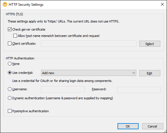 Use credential | Select this option to configure HTTP or OAuth 2.0 credentials. For more information, see Credentials.