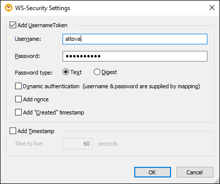 Add UsernameToken | The UsernameToken setting is an optional WS-security element that is present in the header of the SOAP message. The UsernameToken is used by the web server to authenticate the caller of the web service. In the wsse specification, this field corresponds to the following: