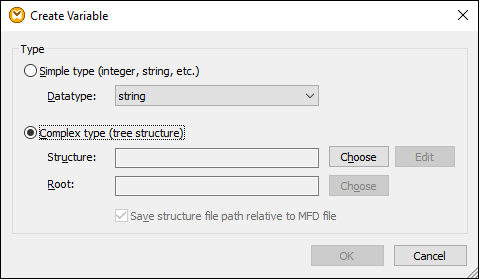 3.Click Choose to select the source which should provide the structure of the variable. The structures illustrated in the screenshot below only apply to MapForce Enterprise Edition. See the list of structures relevant to other MapForce editions in the previous topic.