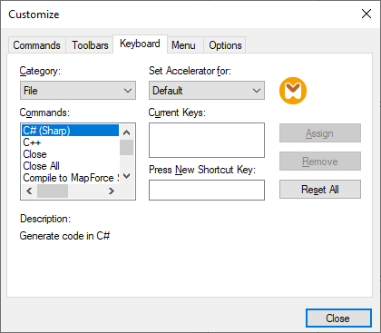 You can define or change keyboard shortcuts in MapForce as follows: Select the Tools | Customize and click the Keyboard tab. To assign a new shortcut to a command, take the following steps:
